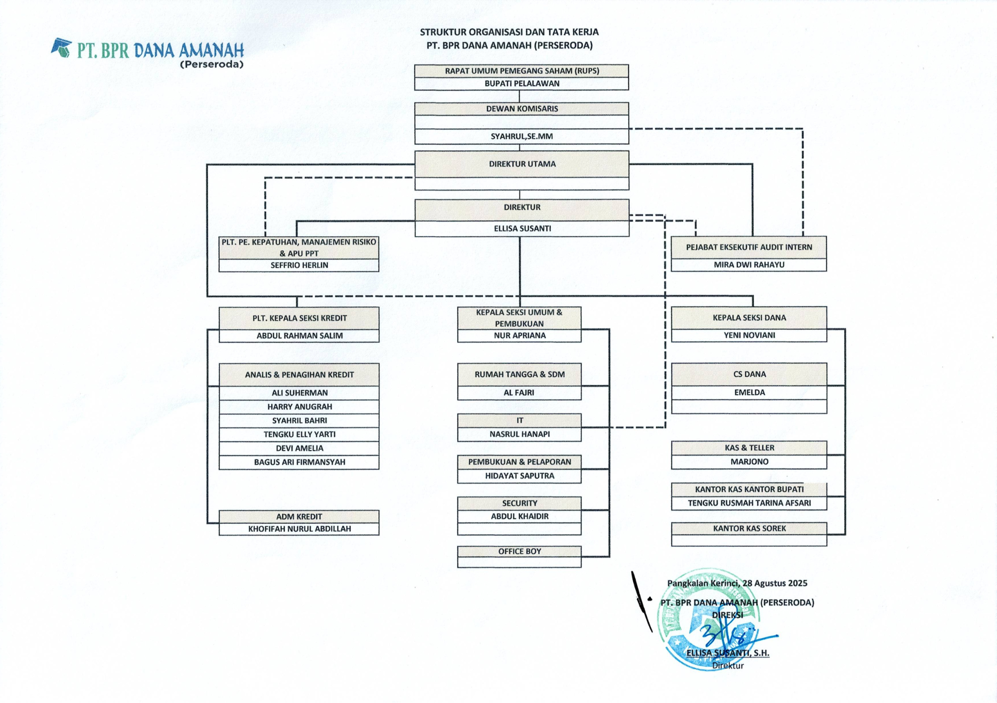 Dengan kondisi tersebut maka di dalam pelaksanaan Tata Kelola, PT. BPR Dana Amanah (Perseroda) berdasarkan pasal 52 poin (1) POJK No.4/POJK.03/2015 tentang Penerapan Tata Kelola bagi BPR bahwa “Dalam rangka memastikan kepatuhan sebagaimana dimaksud dalam Pasal 51, BPR wajib memiliki anggota Direksi yang membawahkan fungsi kepatuhan”.